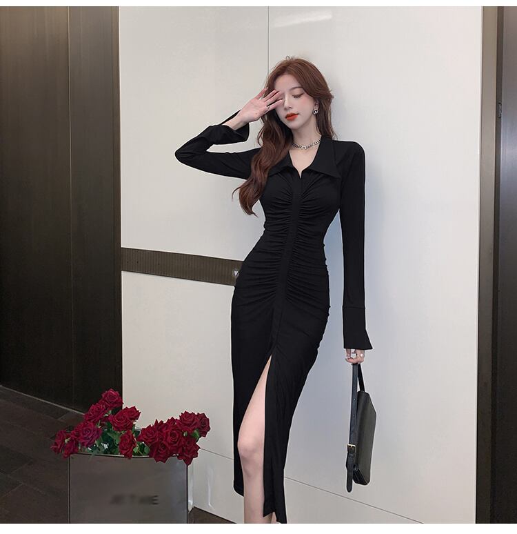 気質 デザインセンス 長袖ワンピース ロングスカート スリム スプリット ハイウエスト